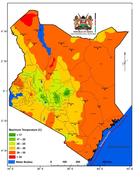 Daytime (maximum) average temperatures of more than 30°C are expected in the Coast, North-eastern and North-western Kenya as well as over some parts of the South-eastern lowlands and the Highlands West of the Rift Valley.