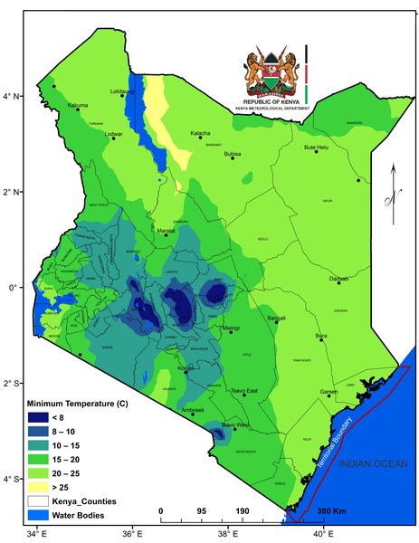 Night-time (minimum) average temperatures are expected to be less than 10°C in some parts of the Highlands East of the Rift Valley, the Central Rift Valley and in the vicinity of Mt. Kilimanjaro.